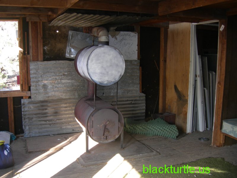 Double Barrel - Stove inside messy cabin.