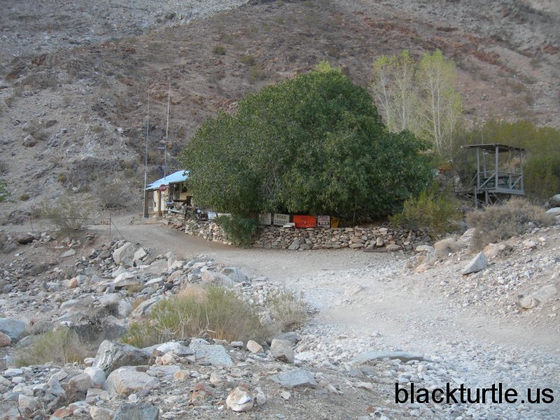Briggs Cabin #1 - Front of cabin decorated with signs.