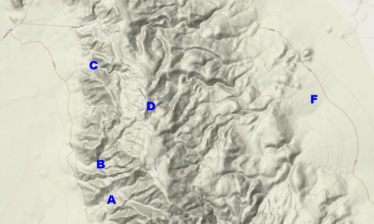 connecting to Trona Road. Quarry Road leads to Area D and Area F can be