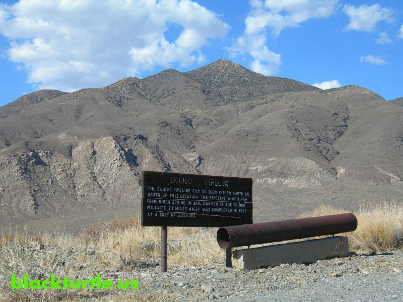 Skidoo Pipeline - Section of pipe displayed along paved section of road leading to kilns.