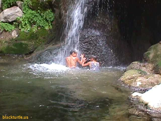 Under the Falls - A couple kids swam out under the falls. The pool is usually about six feet deep right beneath the falls.