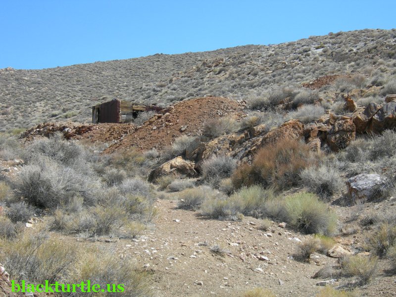 Dirt Mounds and Cabin - Tailings piles and wooden structure.