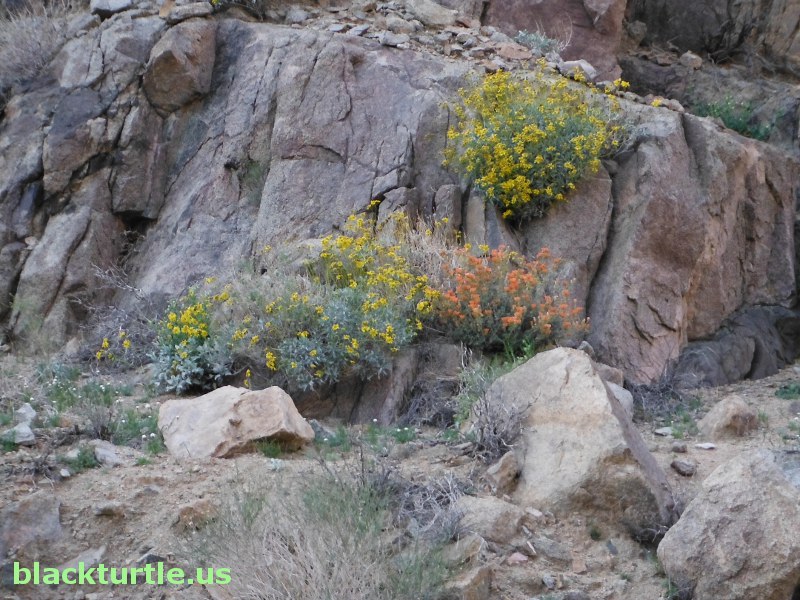 Rock Garden - Apricot Mallow and Brittle Bush growing on rock.