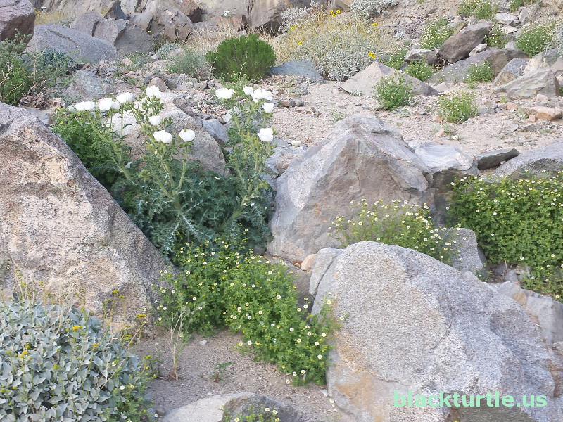 Wash Flowers - Rock daisy, prickly poppy, and brittlebush thriving in Isham side canyon.