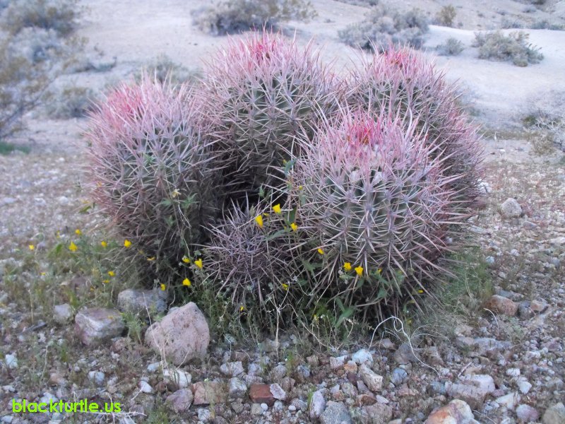 - A cotton top cactus with blazing star plants scattered at its base.