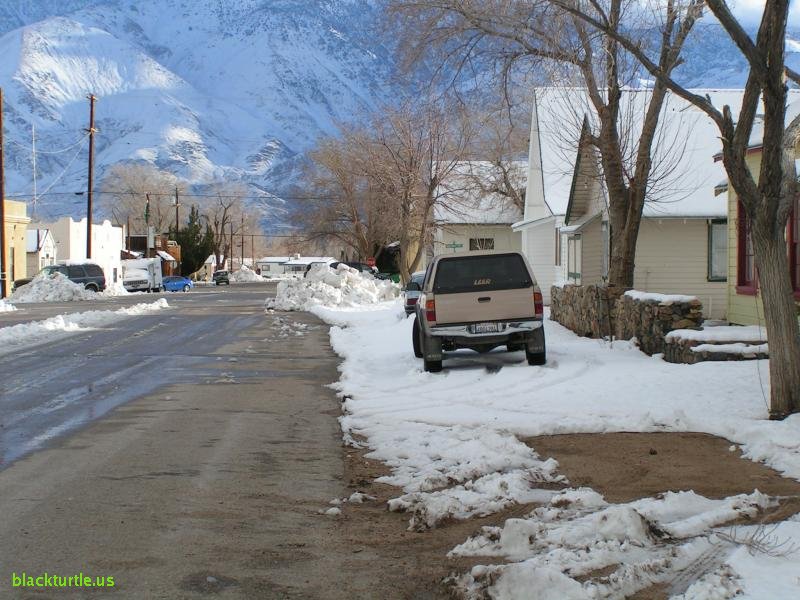 Snow Piles on Bush Street - Piles of snow and brown truck in front of yellow house.