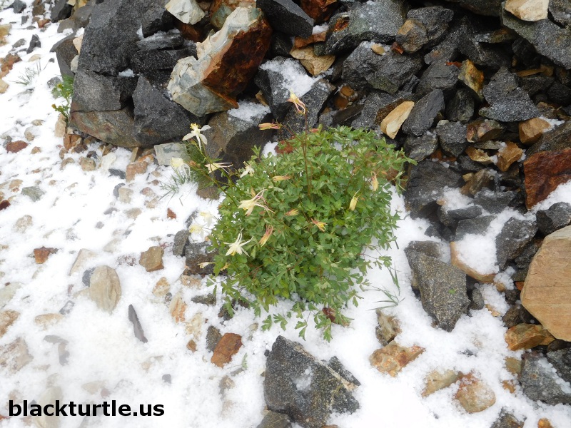 Columbine #3 - An entire plant surrounded by white stuff and rocks.