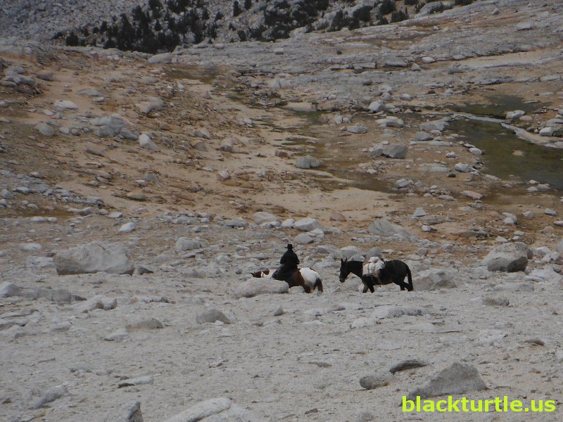 Lone Horseman - A couple pack animals and a rider descending west side of Mono Pass.