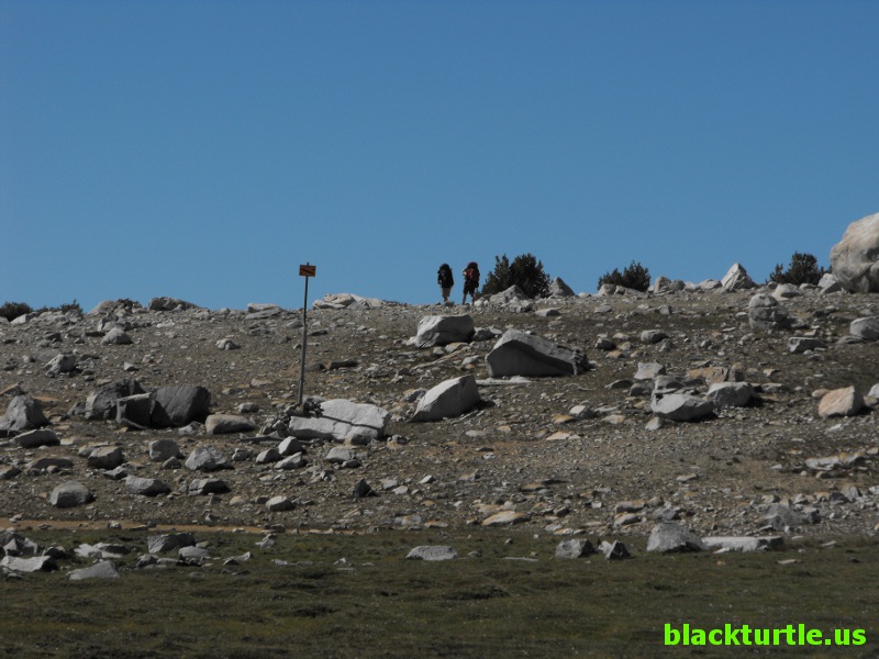 Hikers - A couple hikers disappearing over ridge beyond Summit Lake.